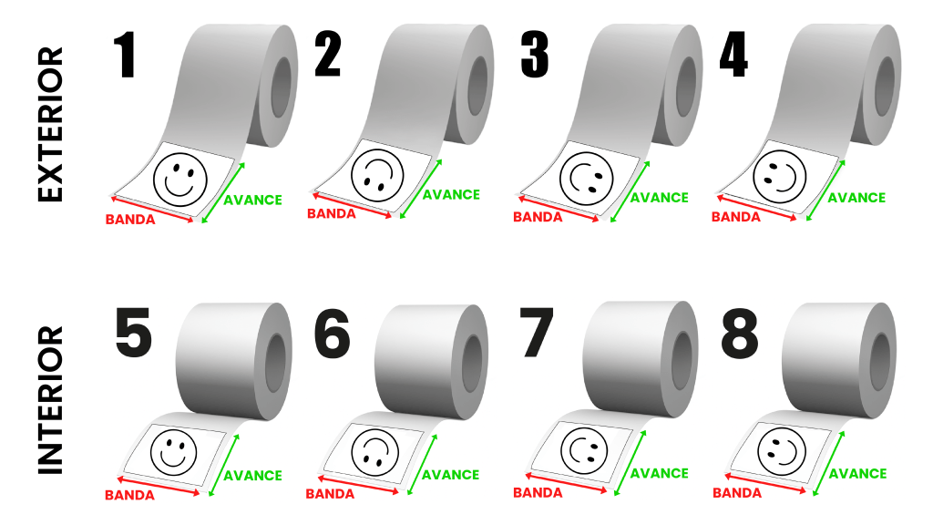 La dirección de salida (también llamada “posición de la etiqueta en la bobina”) indica cómo sale la etiqueta respecto al sentido de avance de la bobina y en qué cara está el adhesivo.